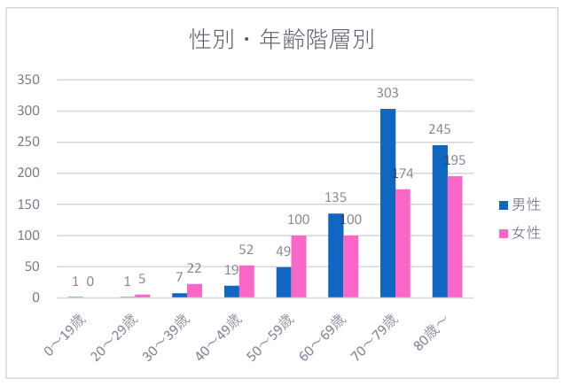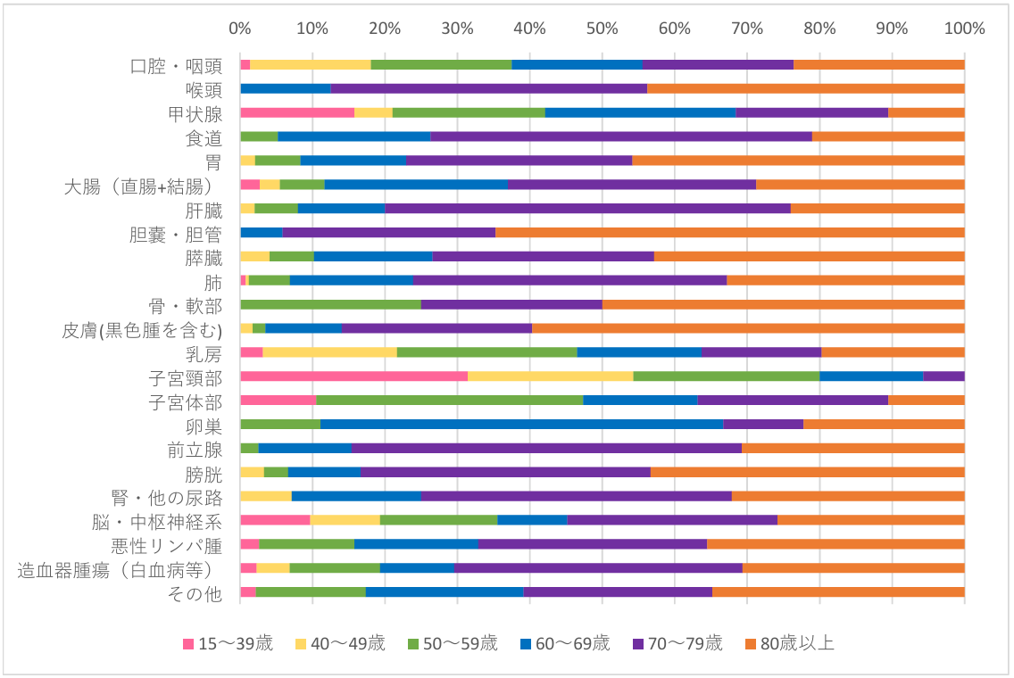 | 部位 | 計 | 0~14歳 | 15~39歳 | 40~49歳 | 50~59歳 | 60~69歳 | 70~79歳 | 80歳以上 |