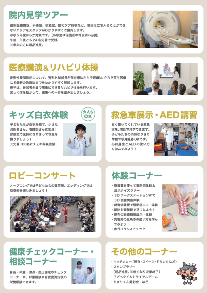 医療や健康をもっと身近に感じていただけるよう、病院スタッフが企画した体験型イベントや相談会、地域とのつながりを深める催しを多数ご用意しています。子どもから大人まで、どなたでも楽しんで学べる内容となっておりますので、ぜひご家族そろってお越しください。
